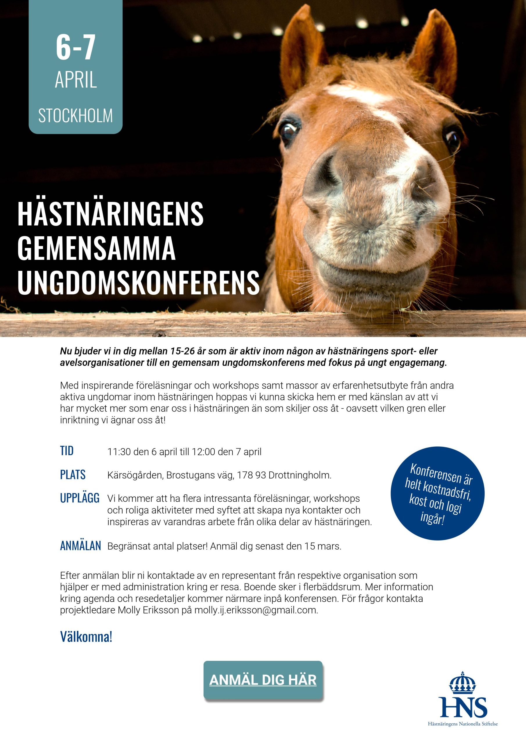 Konferensen är för ungdomar mellan 15-26 år och är dessutom helt kostnadsfri: resa, kost och logi ingår. Passa på att inspireras, lära dig mer och skapa nya kontakter tillsammans med andra engagerade ungdomar från hela hästnäringen!